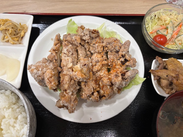 一口サイズで揚げてある唐揚げに対して、1枚を丸ごと揚げているので出てくるときは写真のように切った状態で出されます。